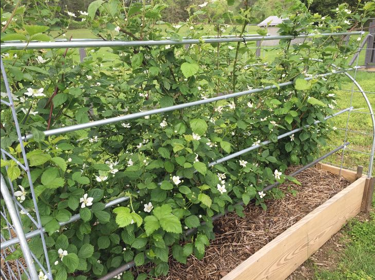 Berries on a trellis with straw mulch in a cottage raised bed. #cottageseed